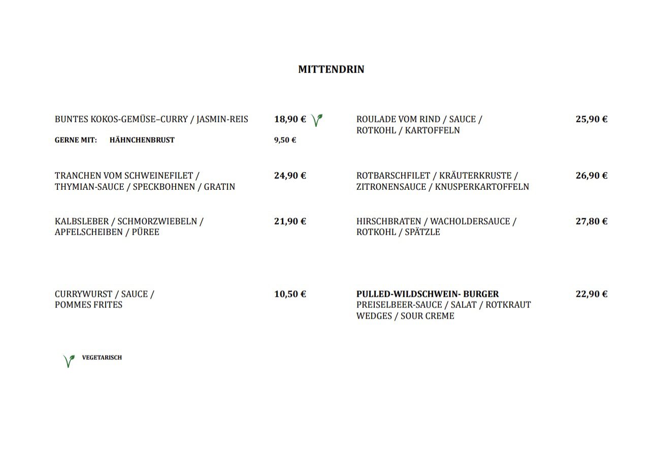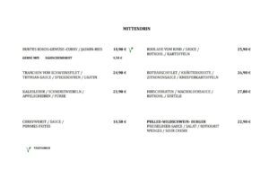 - Sollten Sie oder einer Ihrer Gäste Fragen zu Unverträglichkeiten und/ oder Allergien haben, stehen wir Ihnen gerne zur Verfügung… alternativ reichen wir Ihnen unsere gekennzeichnete Speisekarte